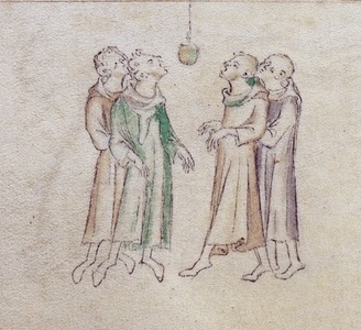 Bobbing for apples, which is a major plot point in both Hallowe’en Party and A Haunting in Venice, is another custom, although it’s uncertain how it became part of Halloween. We know this is very old game because the Queen Mary Psalter, created in the early 1300s, illustrates apple bobbing, although the apples are hanging on strings rather than floating in water.